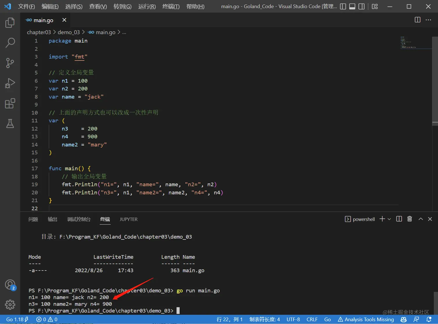 - 如何一次性声明多个全局变量【在GO中函数外部定义变量就是全局变量 】: