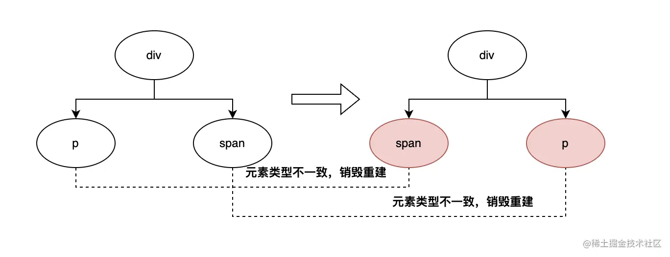 这种情况肯定是销毁重建,因为按顺序Diff,DOM元素发生了变化:p-span,span-p