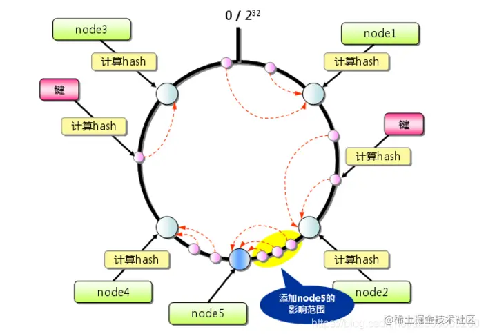 - 然后采用同样的方法求出存储数据的键的哈希值,并映射到相同的圆上。