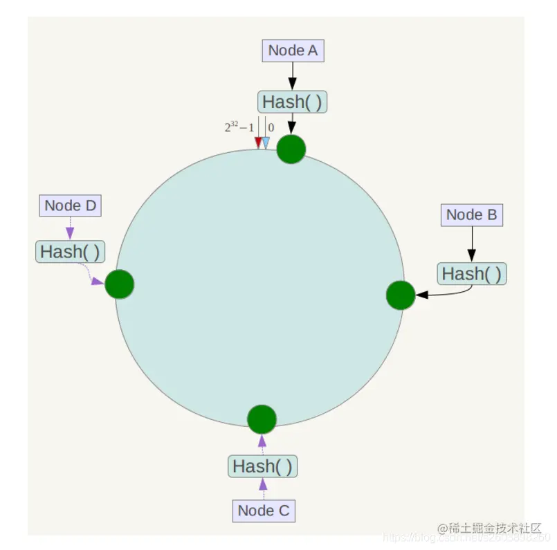 下一步将各个服务器使用Hash进行一个哈希,具体可以选择服务器的ip或主机名作为关键字进行哈希,这样每台机器就能确定其在哈希环上的位置,这里假设将上文中四台服务器使用ip地址哈希后在环空间的位置如下: