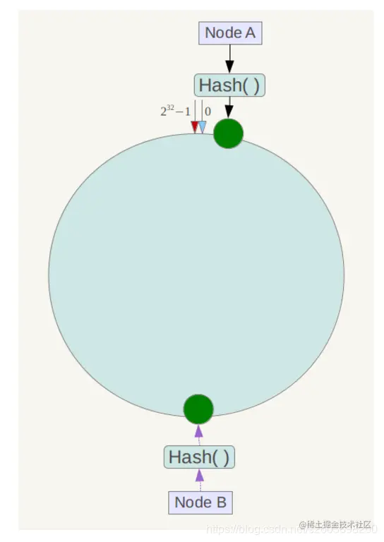 另外,一致性哈希算法在服务节点太少时,容易因为节点分部不均匀而造成数据倾斜问题。例如系统中只有两台服务器,其环分布如下,