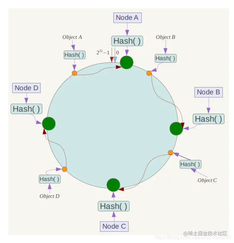 例如我们有Object A、Object B、Object C、Object D四个数据对象,经过哈希计算后,在环空间上的位置如下: