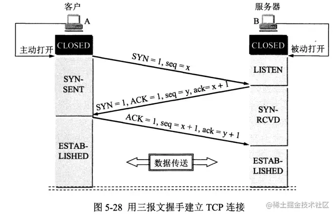 在确认报文段中SYN=1,ACK=1,确认号ack=x+1,初始序号seq=y