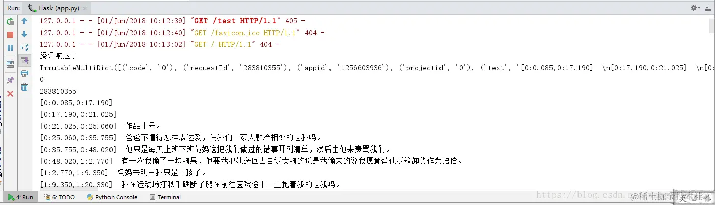 执行之前请求语音识别的方法,等待腾讯的服务器识别后进行回调:下面为回调成功后的截图: