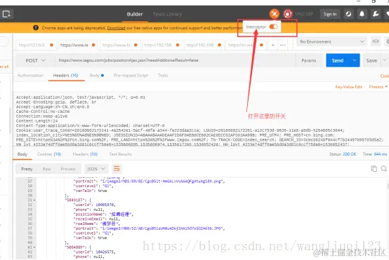 这里需要注意:打开postman中的interceptor。不然postman不会使用自定义的伪造头。