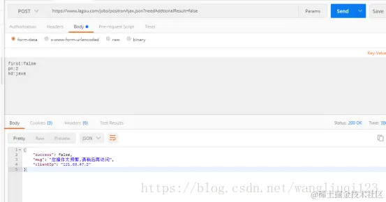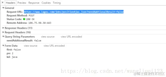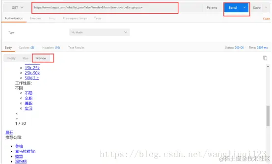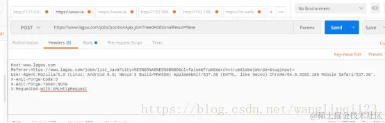 经过肉眼筛选。我们发现第一条里面才是包含的真实招聘信息的json串。接下来我们点击Hearder复制请求的地址,使用PostMan访问一下看看: