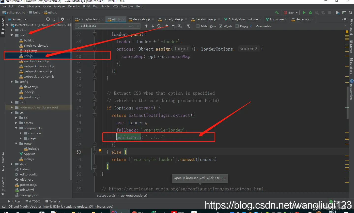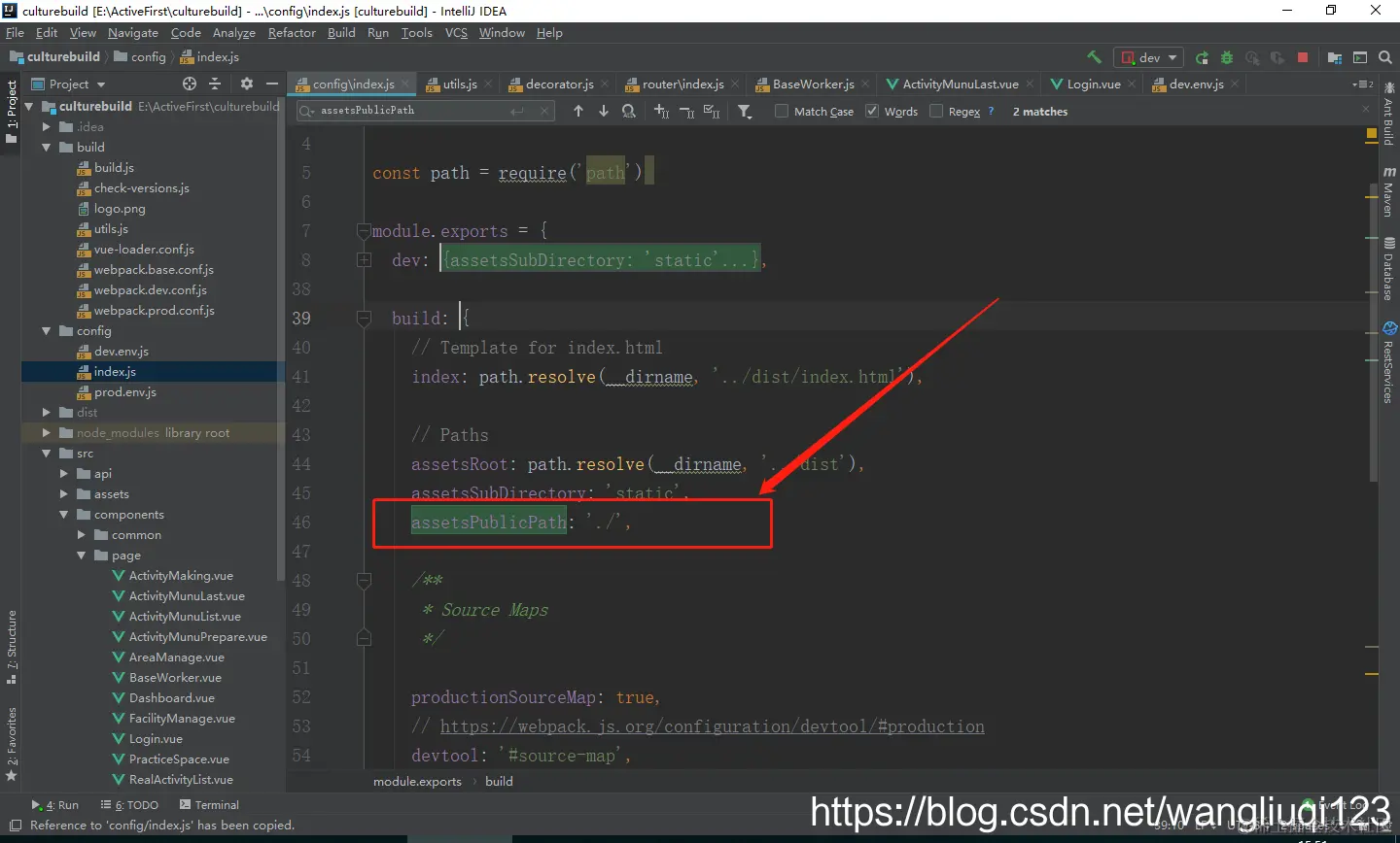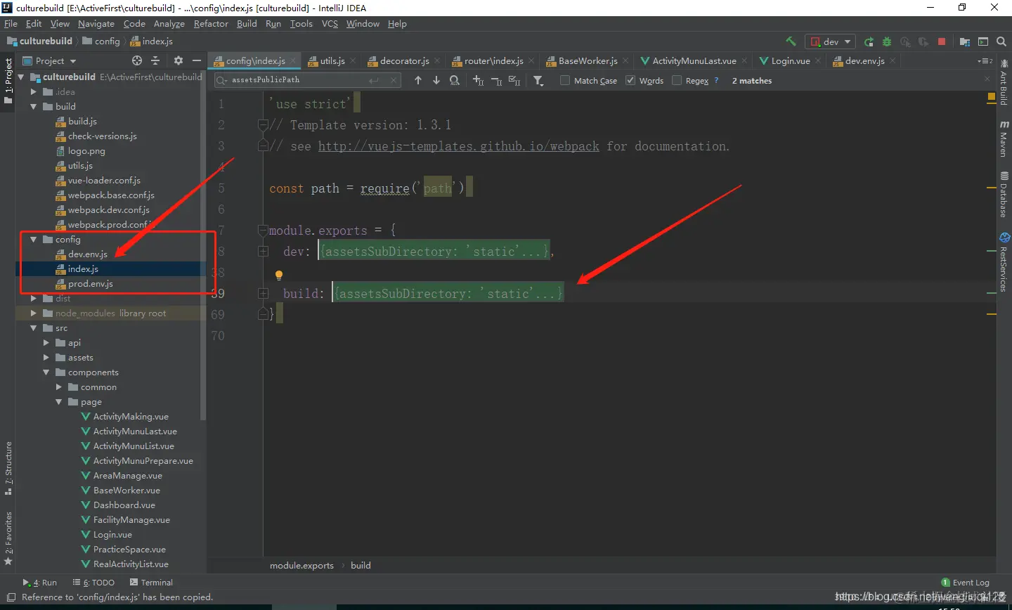 1:项目目录下的 config/index.js,折叠后看到有两个map。我们需要修改第二个build里面的内容: