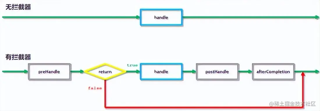 注意:拦截器中的 preHandler 方法,如果返回true,则代表放行,会执行原始Controller类中要请求的方法,如果返回false,则代表拦截,后面的就不会再执行了。