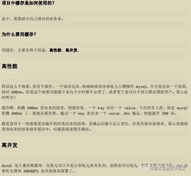 只要问到缓存,上来第一个问题,肯定是先问问你项目哪里用了缓存?为啥要用?不用行不行?如果用了以后可能会有什么不良的后果?