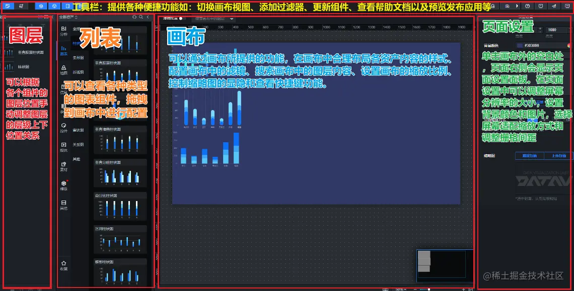 那么我们可以将页面分为左中右三个区域,左面我们成为组件去,主要是用来存放组件以及图层;右面我们称之为配置区,主要用来设置组件的外观,配置数据已经设置页面的交互;中间我们称为画布。