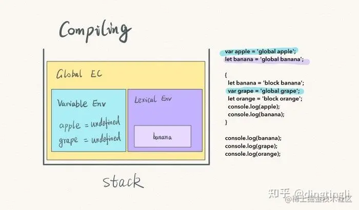 在编译阶段,第一行代码被跳过,因为它与变量声明没有关系。然后第二行中的变量 apple 在变量环境中被声明,并赋值 undefined。此时,编译阶段结束。
