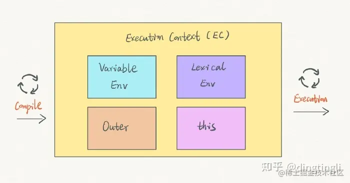 在 ES2018 中,执行上下文又变成了这个样子,this 值被归入 lexical environment,但是增加了不少内容。