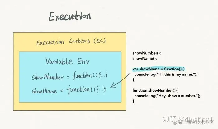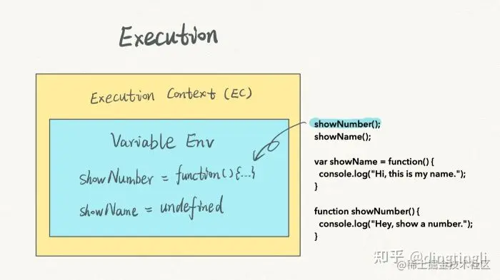 在编译阶段,showNumber 是一个声明,所以在这个时候它将被保存到执行上下文中。