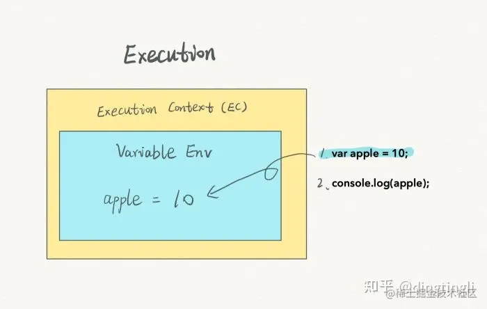 然后执行第二行代码,console 开始在变量环境中寻找变量apple,并成功找到。最终,console.log 输出 10 到控制台。