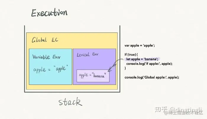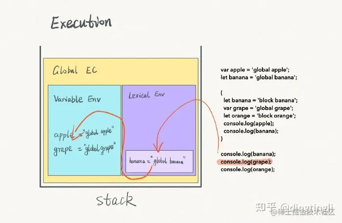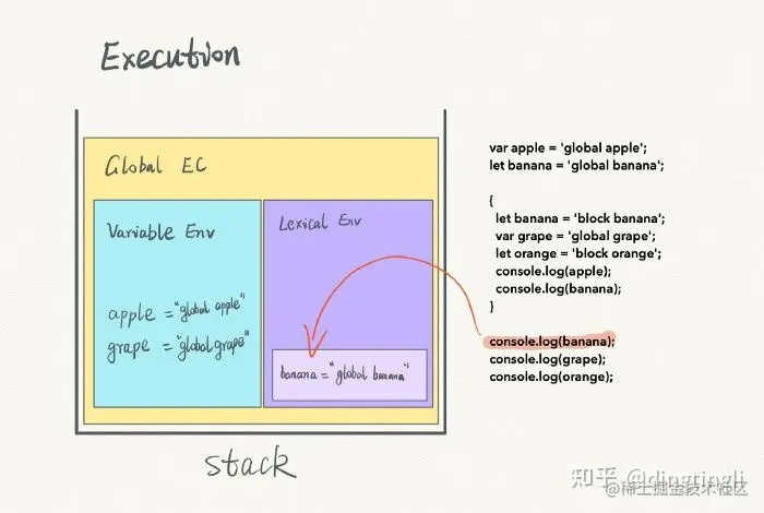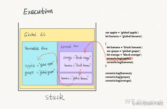 当查找变量banana时,JavaScript 引擎遵循同样的步骤,最终在词法环境的顶端找到变量banana,然后输出block banana。