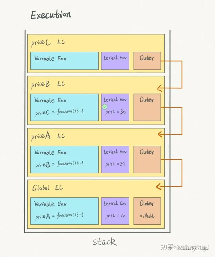priceC 函数执行上下文中,outer 指向 priceB 函数执行上下文; - 在