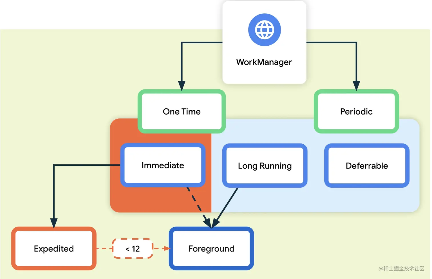 为了保持加急作业的向后兼容性,WorkManager 可能会在 Android 12 之前版本的平台上运行前台服务。前台服务可以向用户显示通知。