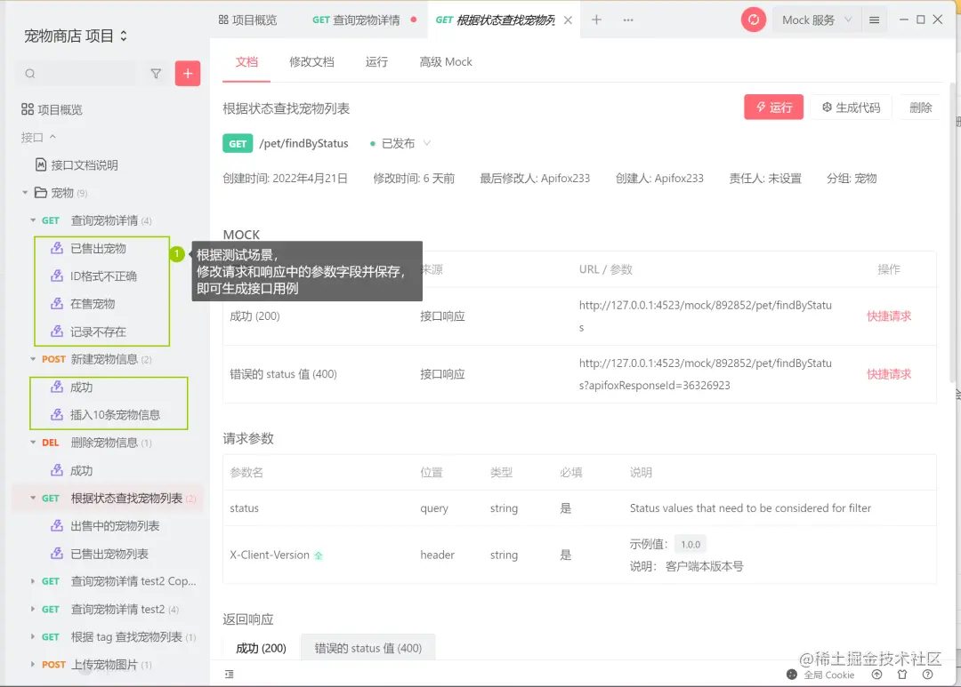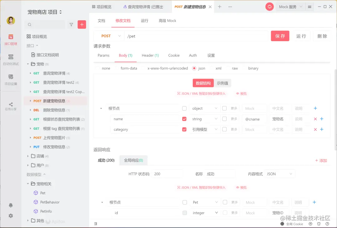 和swagger需要通过编写代码形成接口页面不同,Apifox只需要填写请求参数、请求方法,响应参数、添加接口说明就能生成一份接口文档。