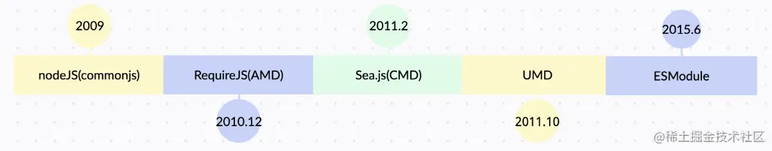 于是社区借鉴其他语言的优点,开始推动前端模块化。下图是几个模块化重要的时间点,借着这个时间线,讲讲模块化发展的历程。