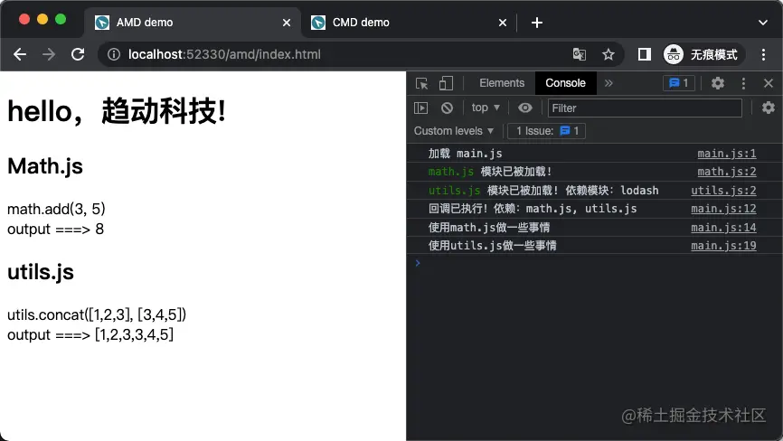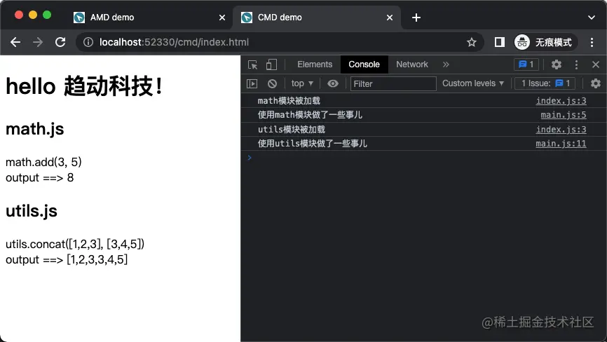 因为在Node.js环境下反馈比较好,社区大佬们便开始把这套规范带到浏览器端。于是乎,出现了像AMD、CMD这种支持在浏览器端的模块加载方式,并且流行了一段时间。