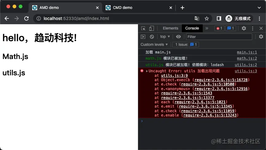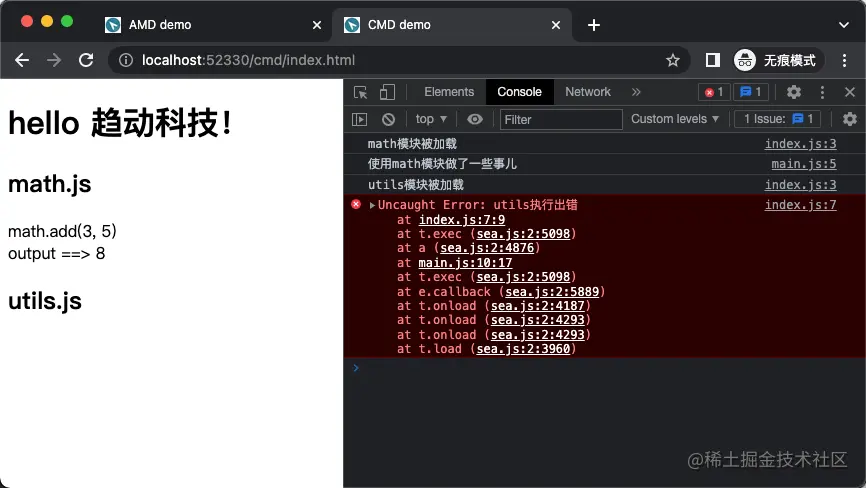 加载到错误模块之前,所有的代码都是会正常执行的。这个差异就是CMD最核心的差异了,以玉伯为代表的开发者认为这对他们来说是一种更为自然的流程。