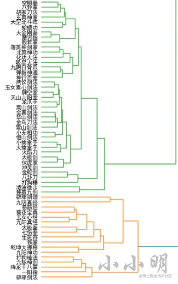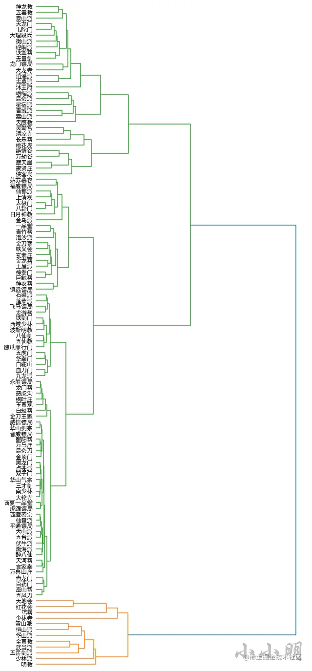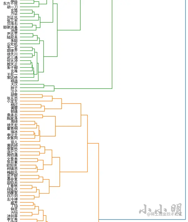 现在我们采用层级聚类的方式,查看人物间的层次关系,这里同样龙套角色不再参与聚类。