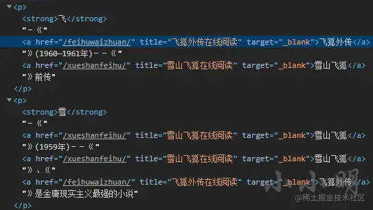 下面首先获取这15部作品的名称、创作年份和对应的链接。从开发者工具可以看到每行的a标签很多,我们需要的节点的特征在于后续临近节点紧接着一个创作日期的字符串: