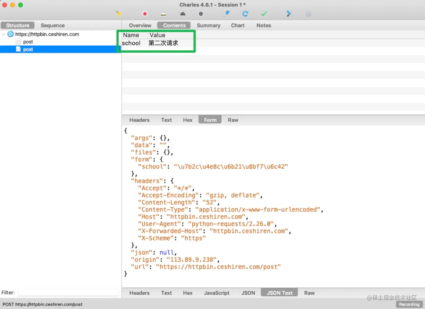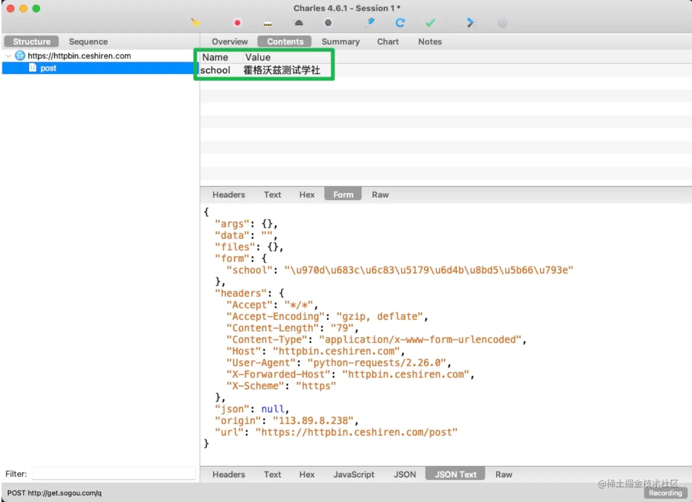 - 如下图所示,在页面发起正常的请求信息,post 请求中,请求数据 key 值为 school,value 值为霍格沃兹测试学社: