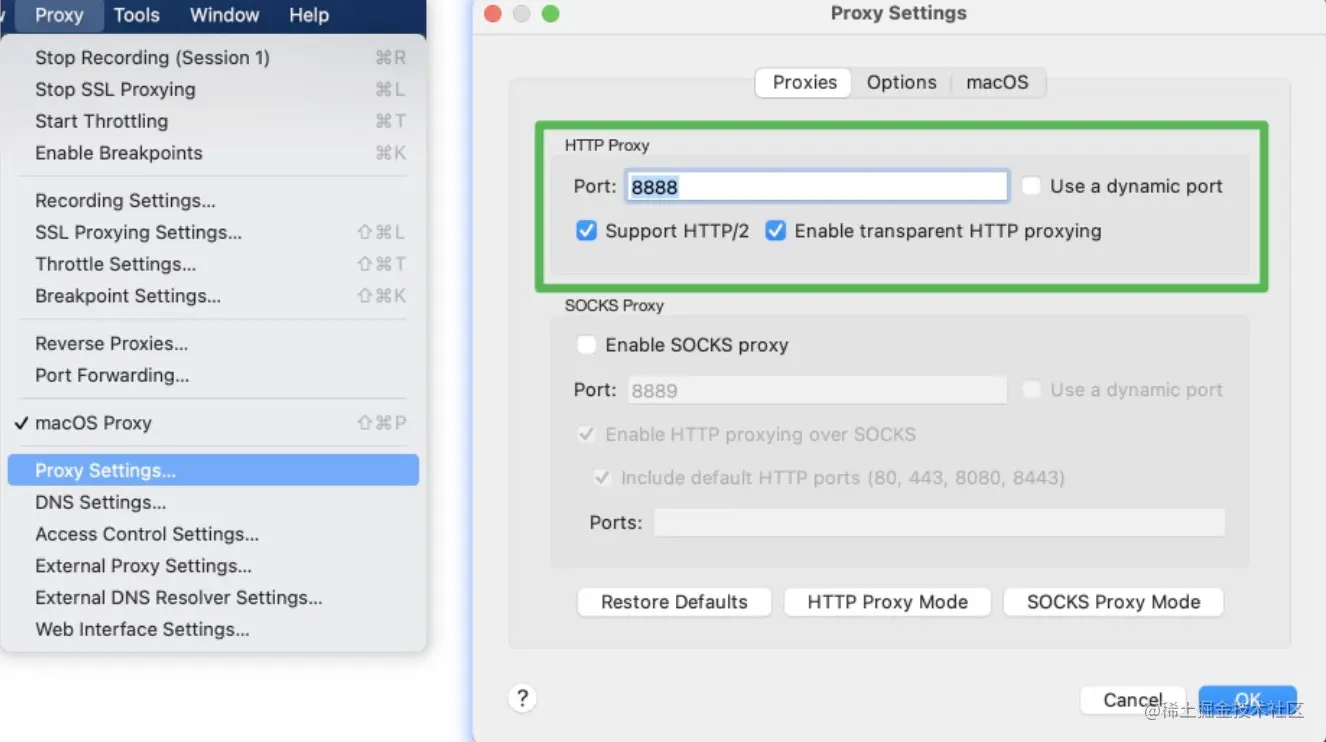 - 抓包工具设置的端口,与代码的代理地址端口保持一致,如下图所示: