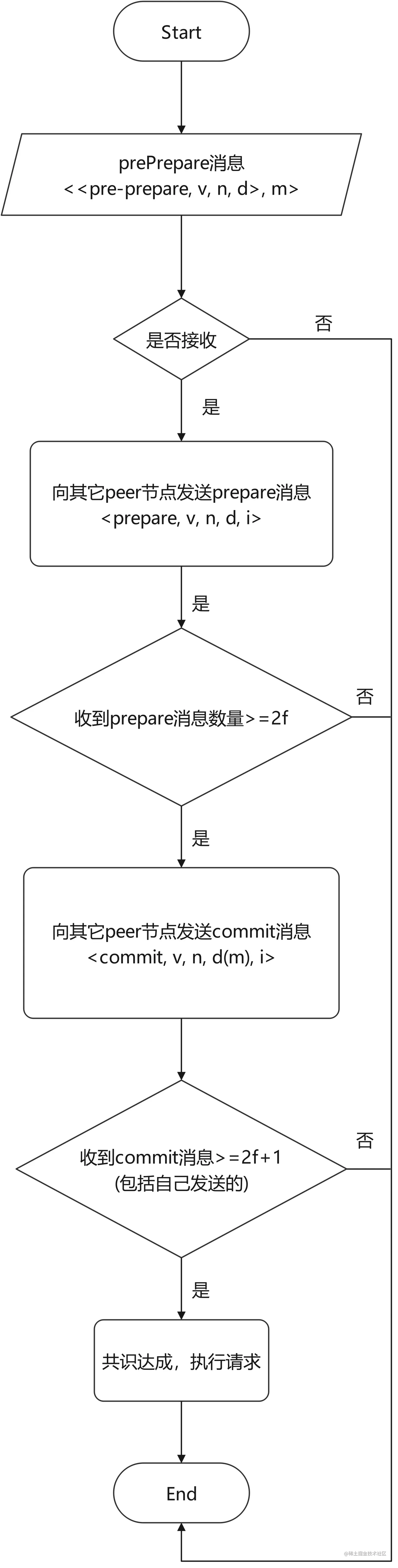 - 客户端收到来自f + 1个节点的相同消息后,代表共识已经完成