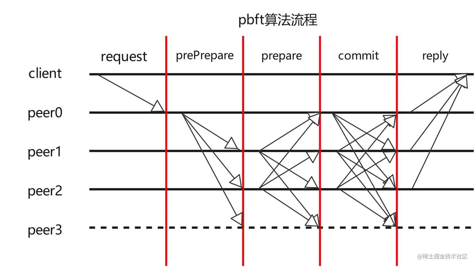 - 主节点广播请求给其他节点,节点执行pbft算法三阶段共识流程