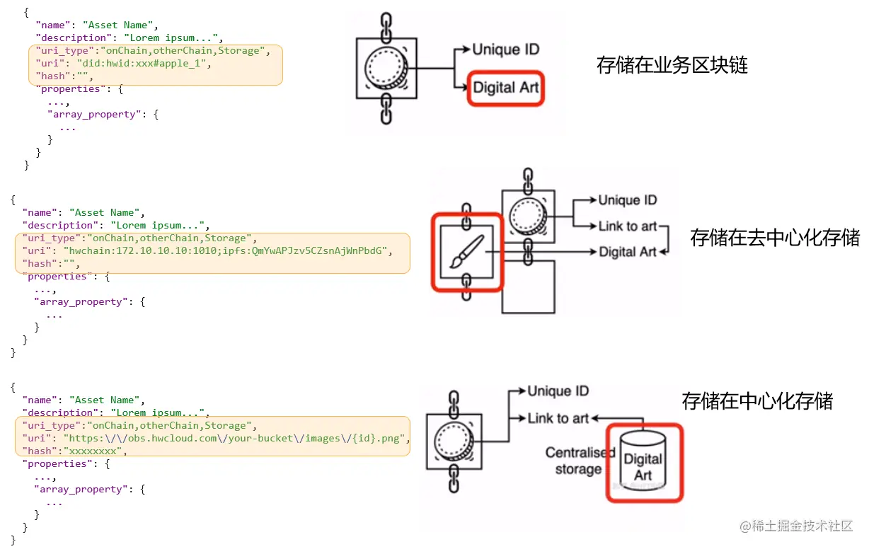 “一切皆可数字资产”这句话从侧面表达了数字资产对数字化数据的包容性。不论标的物是视频、音频、还是文字、图片、3D模型等各种数据格式,都可以在链上生成对应的唯一标识。标的物实际存储的位置通常有三种选择,数字资产标识所在的业务区块链、去中心化存储系统、中心化的存储系统。