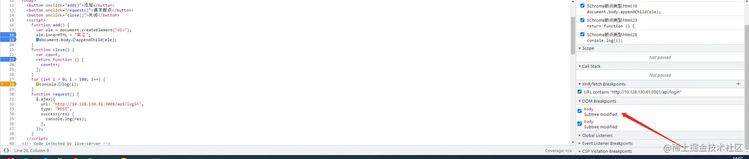 - dom断点:即Elements面板提及过的三种DOM断点: 分为: