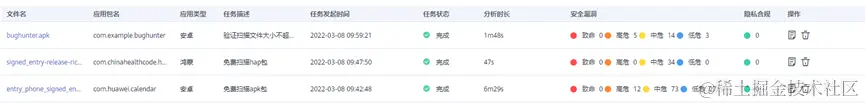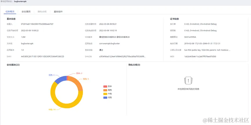在线报告如下图所示,分为“任务概览”、“安全漏洞”、“隐私合规”、“基础组件”4个tab页签,其中隐私合规不支持查看,点击可分别查看相应信息。