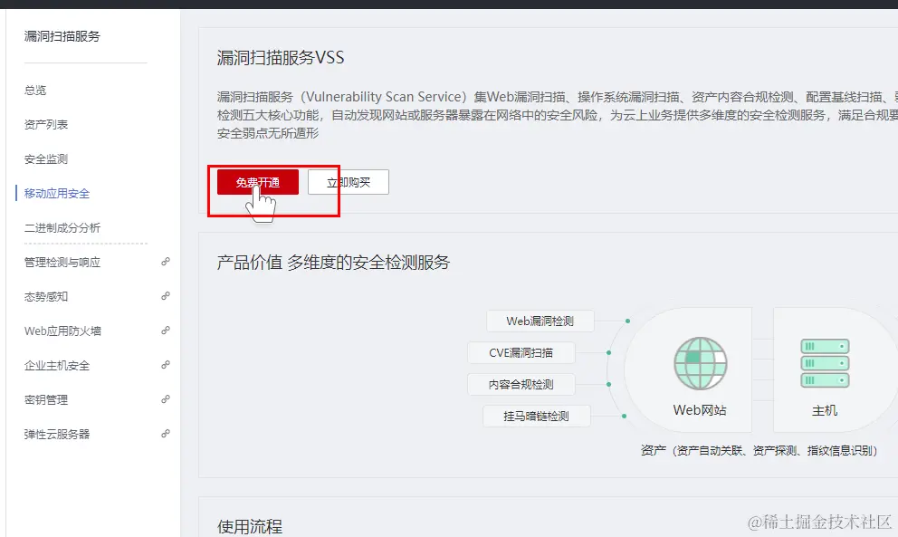 2、首次使用可以单击“免费开通”体验移动应用安全服务,进入任务列表页面。