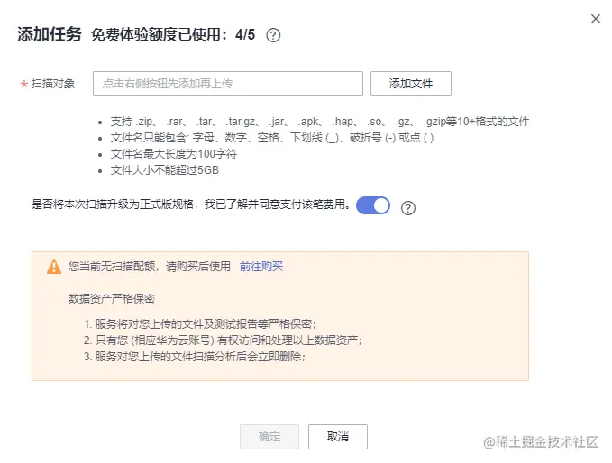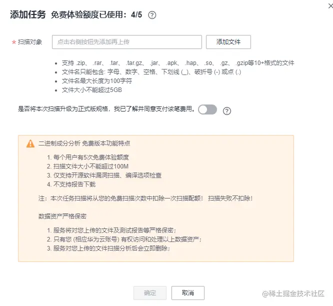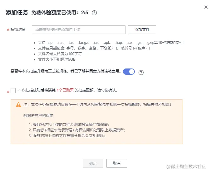 注:若打开升级按钮,本次扫描将升级为正式版规格,任务扫描成功后一小时内将从您购买的套餐包中扣除一次扫描配额。正式版任务限制文件大小为5GB,支持开源软件风险、信息泄露风险、配置类风险等3大类,支持报告导出。