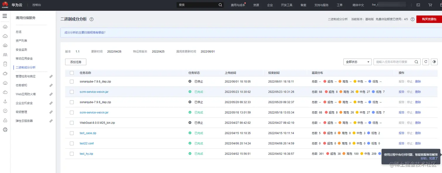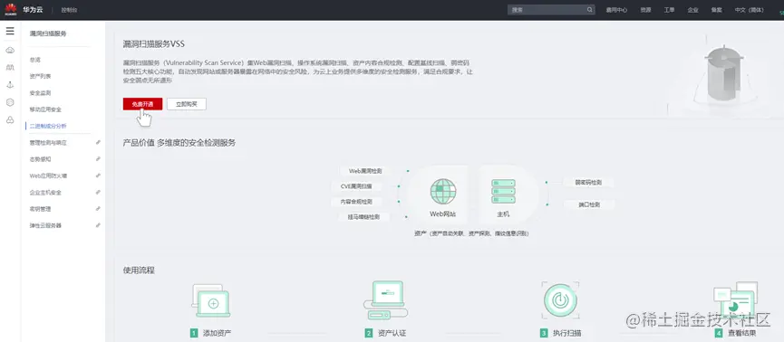 1. 使用Chrome浏览器,登录[漏洞扫描服务],在左侧导航栏,单击二进制成分分析。
