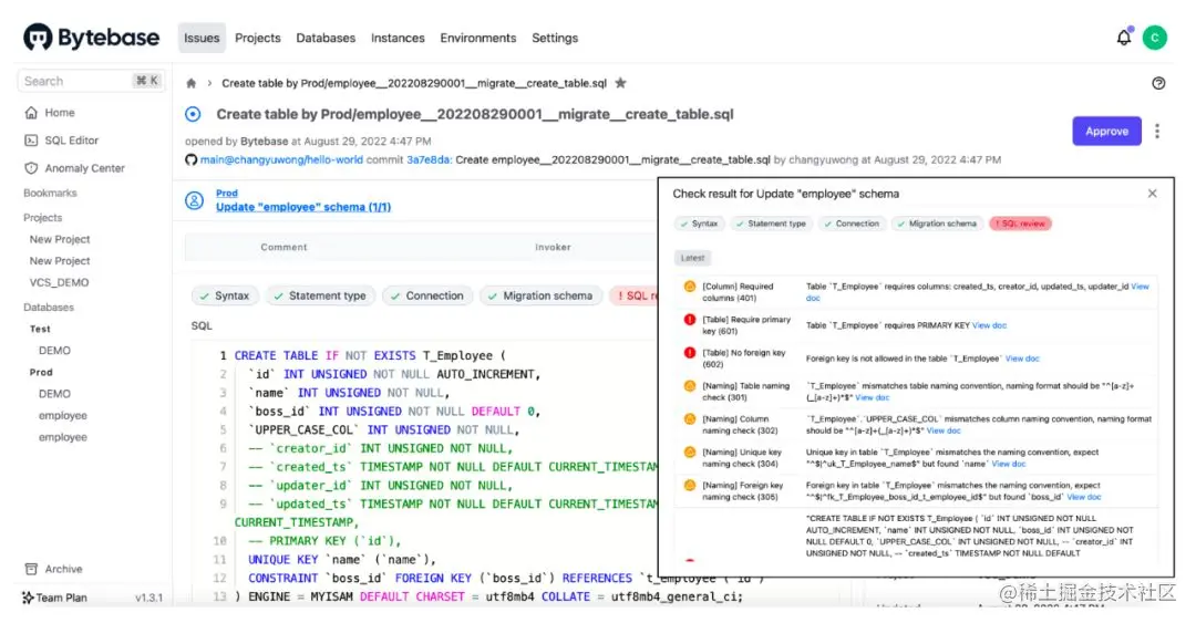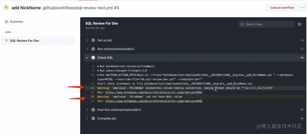 - 触发 Bytebase 提供的 SQL Review Action 进行自动化 SQL 审核,并给出修改建议;