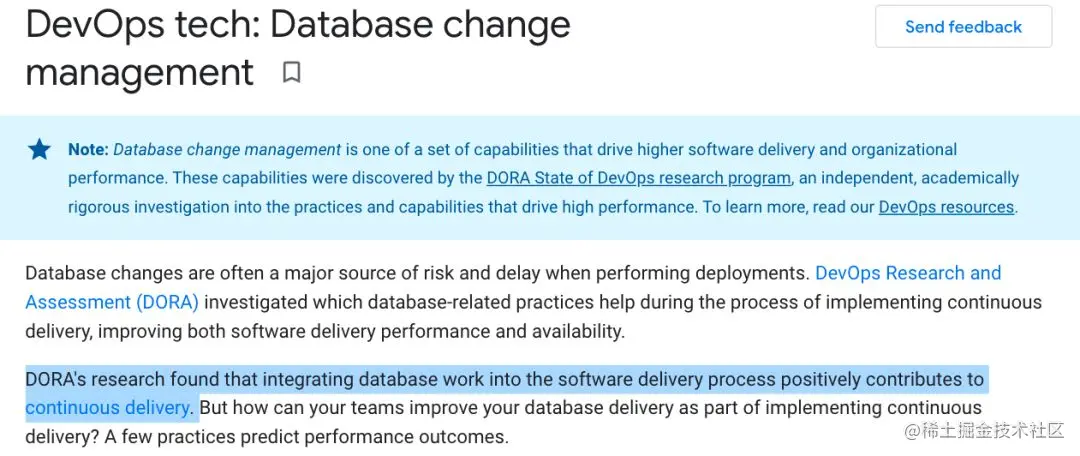 DORA(DevOps Research & Assessment)是一家专注于 DevOps 的研究机构, 在该领域以专业与客观著称。自 2014 年以来,DevOps 调研了全球范围内超过 32,000 名专业人员,并以年度报告的形式对外发布研究成果。DORA 明确指出,将数据库变更纳入应用发布流程将显著提升整体发布效率。