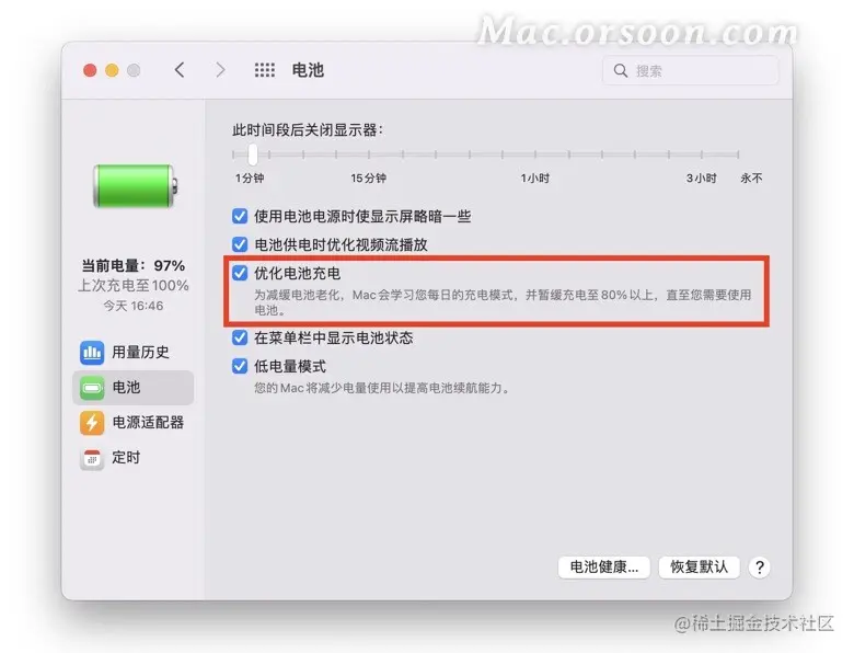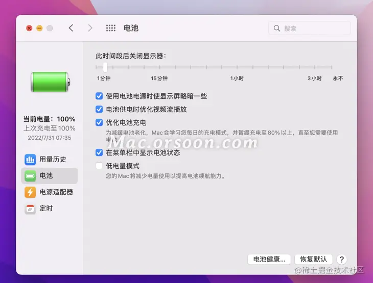 在 Mac 系统设置的「电池」选项下提供了有助于延长 Mac 笔记本电脑电池续航能力的设置。以 macOS Monterey 为例。