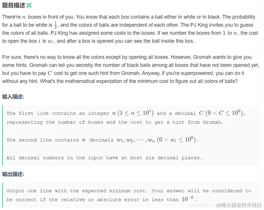 有两条确认颜色的路线可选: 1、暴力开启所有盒子,这样花费的代价是w[i]. 2、花费c代价,然后从代价最小的盒子开始开,对于每一次开盒,该次开盒后能确认所有盒子颜色的概率为(1-1/2)。
