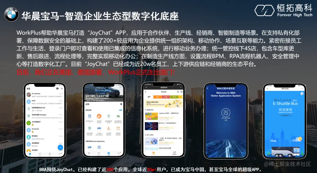 WorkPlus与华晨宝马达成合作后,根据企业统一门户移动化的建设需求,帮助华晨宝马打造“JoyChat”APP,应用于合作伙伴、生产线、经销商、智能制造等场景。在支持私有化部署、保障数据安全的基础上,构建了200+轻应用为企业将组织架构、人员管理的分级分权,权限管理等功能也做了更精细化的定制,实现全场景互联。紧密衔接员工工作与生活,登录门户即可查看和使用已集成的信息化系统,进行移动业务办理;统一管控线下4S店,包含车型库更新、售后跟进、流程处理等,完整实现移动化办公;在制造生产线方面,设置流程BPM、RPA流程机器人、安全管理中心等打造数字化工厂。目前“JoyChat”已经成为近20w名员工、上下游供应链和经销商的生态平台,WorkPlus往后将继续助力企业互联互通,协作便捷,运转高效的数字化平台建设!