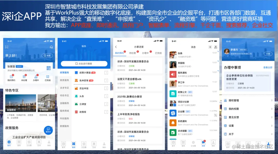 由深圳市工信局牵头,联合市政数局等部门共同打造一站式市场主体培育和企业服务平台“深i企”。WorkPlus为“深i企”提供了包括社交中心、应用门户、千企千面、搜索引擎、智能表单等在内的数字化底座。在政企之间搭建了一座互联互享的沟通桥梁,为企业社交圈打通市区各部门数据。截至目前,“深i企”平台已累计注册企业用户已达149万家,实现了政策一站通、诉求一键提、业务一窗办、服务—网汇,是深圳市各级政府部门开展科技抗疫和提供企业服务的有力手段。
