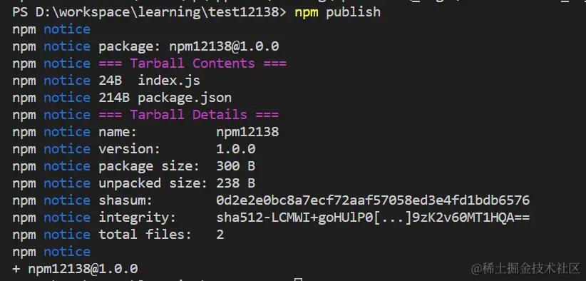 4、验证好邮箱之后,重新登录,然后npm publish,成功后如下所示: