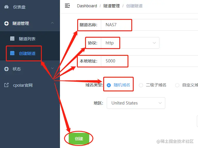 启用群晖系统的SSH功能后,我们就可以进入cpolar客户端界面,建立一条能够连接公共互联网的数据隧道。在cpolar主界面,我们点击“隧道管理”项下的“创建隧道”。在隧道创业页面,我们需要对这条隧道进行几项定义:“隧道名称”是对这条隧道的命名,这里我们输入NAS7;“协议”我们选择http;“本地地址”为5000(5000是群晖系统的默认管理端口);“域名类型”我们先选择随机域名(更高级设置我们会在之后介绍);“地区”则按实际使用地区选择,这里我们选择China VIP。
