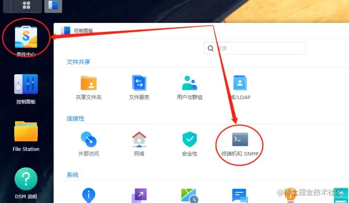 在上篇文章中,我们在群晖系统中成功安装了cpolar客户端(关于cpolar面板功能介绍,请参见《Cpolar的面板功能介绍》)。不过要让群晖系统接受远程操作和访问,我们还需要进行几个简单设置。首先在群晖的控制面板内找到“终端机和SNMP”选项