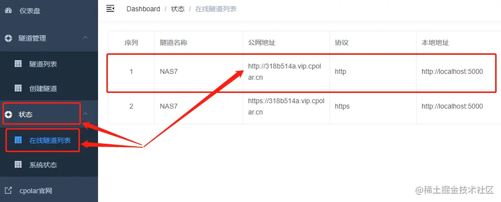 在完成各项定义后,就可以点击下方的“创建”按钮,建立起名为NAS7的数据隧道。此时我们回到左侧功能边栏,点击“状态”项下的“在线隧道列表”。在这里,就能看到我们刚刚建立起的名为NAS7的数据隧道。