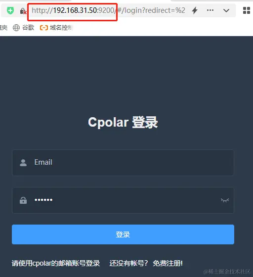 在新开的Web页面,我们能看到cpolar客户端在本地的地址,以及cpolar客户端的登录界面。如果没有cpolar账号的,可以通过该页面下方的“免费注册”链接,快速轻松的获得cpolar账号。