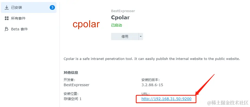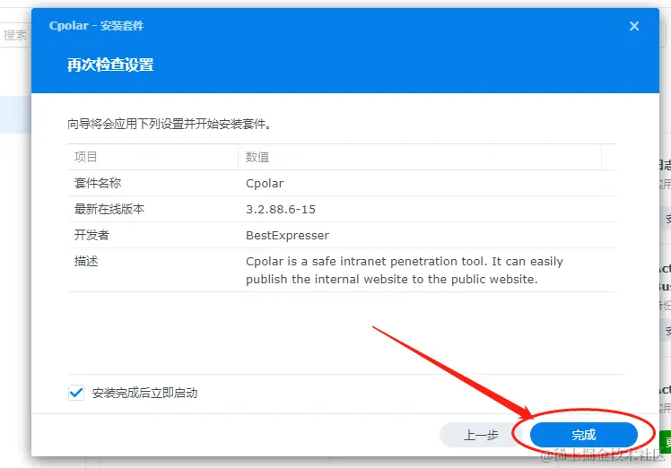 点击同意后,群辉系统会对安装信息进行确认,我们继续点击“完成”。只需等待很短时间,cpolar就能安装完成,此时回到套件中心主页,就能看到cpolar已经加入了“已安装”列表内。