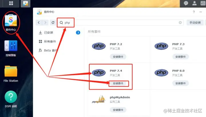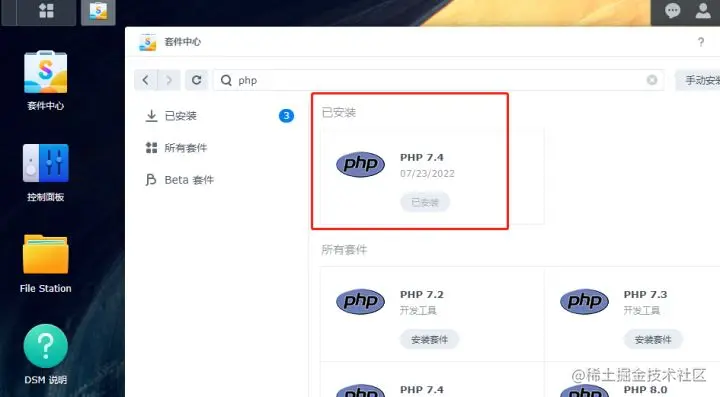 打开群晖系统的套件中心,在搜索框中输入php,从中找到php7.4,点击图标下方的“安装套件”进行安装。